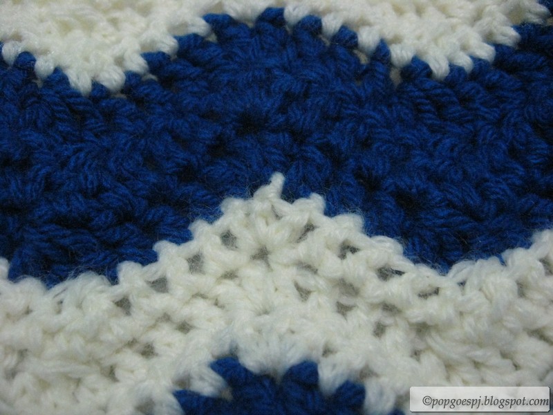 The pattern consists of a sequence of 3 dc + dc3tog [forming the "valley"] + 3 dc + 3 dc in the next stitch [forming the "peak"]. So, yeah, it's not so much a pattern as it is variations on the double crochet - child's play for most crocheters. The thing that makes it different is the sheer *scale* of the thing, I guess.